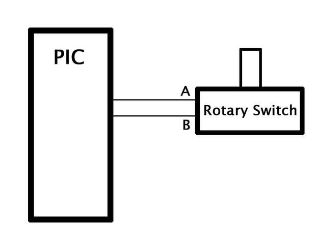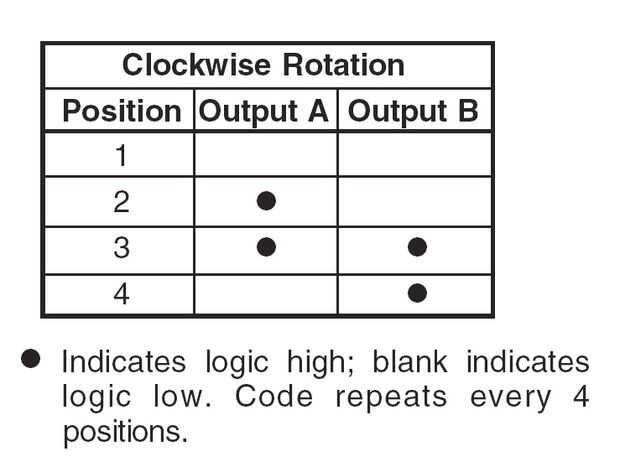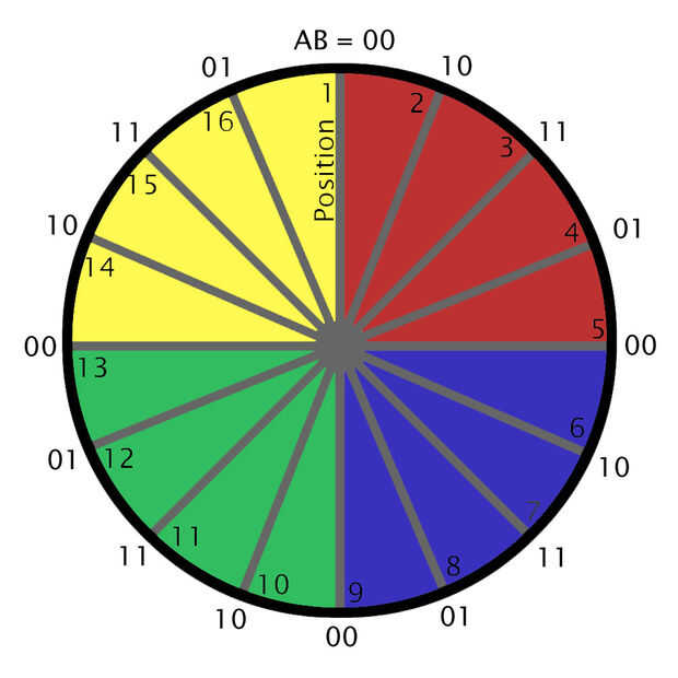 Mencioné anteriormente que el interruptor fue codificado de cuadratura. Esta es también una de las elegancias claves en esta solución. Esto significa que hay un código de 2 bits que el interruptor da que corresponde a la posición del interruptor. Usted podría estar pensando: "Si hay una entrada de dos bits para el microcontrolador, ¿cómo representamos todas las 16 posiciones?" Es una buena pregunta. No representamos a todos. Sólo necesitamos conocer la posición relativa de la perilla por lo que podemos determinar la dirección de rotación. La posición absoluta de la perilla es irrelevante. Para rotación a la derecha, el código que da el interruptor repite cada cuatro retenes y se cifra gris. Código gris significa que hay sólo un bit cambia en cada cambio de posición. En vez de la AB entrada contando para arriba para rotación a la derecha en binario así: 00, 01, 10, 11, cambia así: 00, 01, 10, 11. Observe que para el segundo patrón, es sólo una entrada cambiar entre conjuntos. Los valores hacia la izquierda para la entrada de AB al microcontrolador se ven así: 00, 01, 11, 10. Esto es simplemente la inversa de la pauta hacia la derecha con AB = 00 muestra en primer lugar.