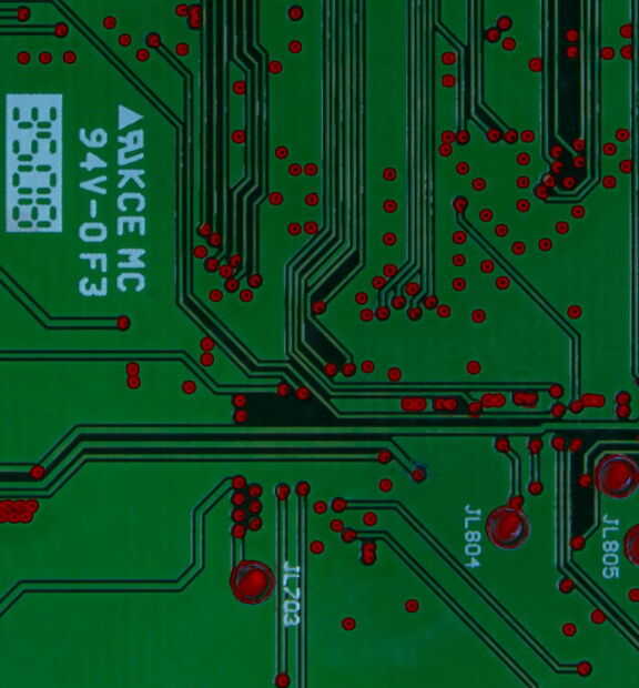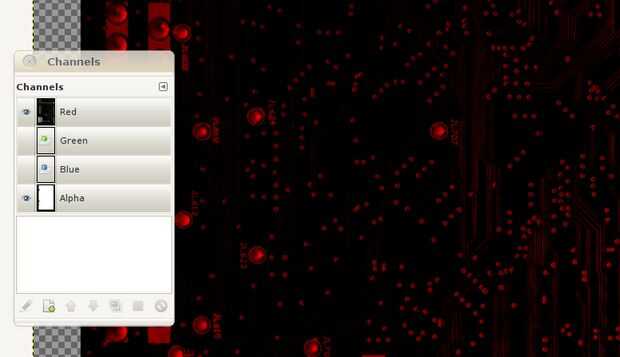 Si los electrodos son de cobre de color sobre un tablero verde, como en el ejemplo, abra el diálogo de canales y apague los canales verdes y azul. Con un poco de suerte, usted a ver a las pastillas. Si no es así, tienes un poco más trabajo que hacer - véase el párrafo siguiente para los detalles. Ir a capa > nueva de Visible. Volver a activar los canales azul y verdes. Añadir una nueva capa rellena con rojo y cambiar el modo de la capa roja a oscurecer sólo. Puede repetir el proceso con otra capa de rojo. Eliminar cualquier capas que eres ya no utiliza, como las capas roja y el primer nuevo de Visible si ha creado más de uno.