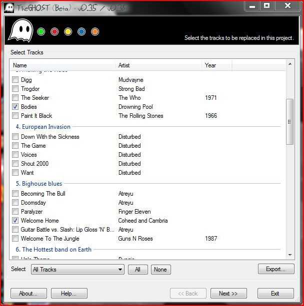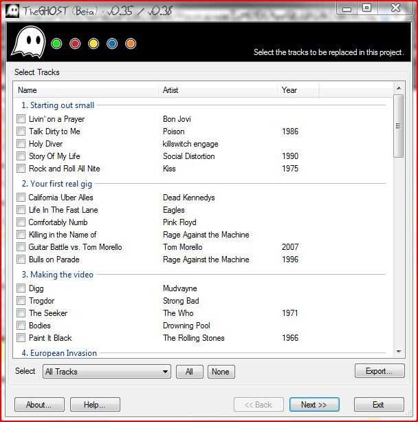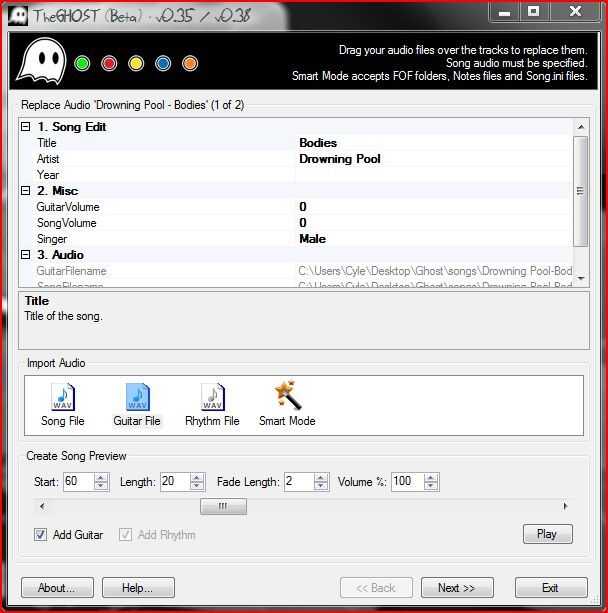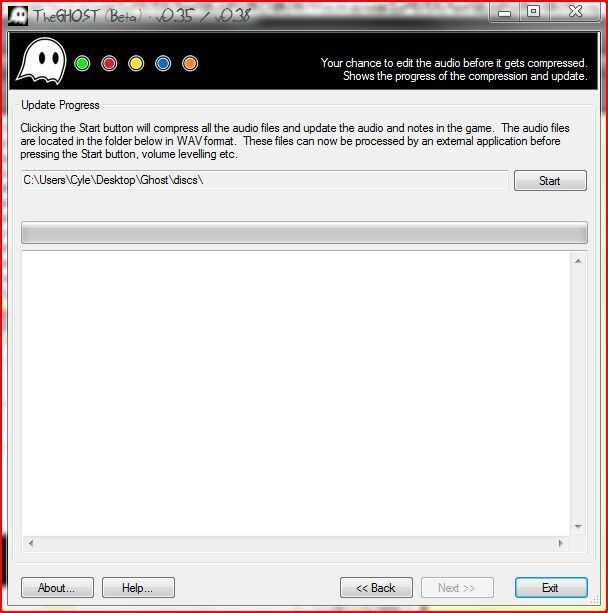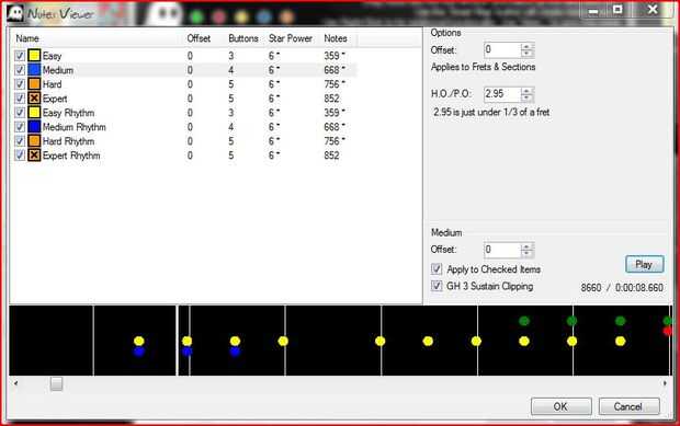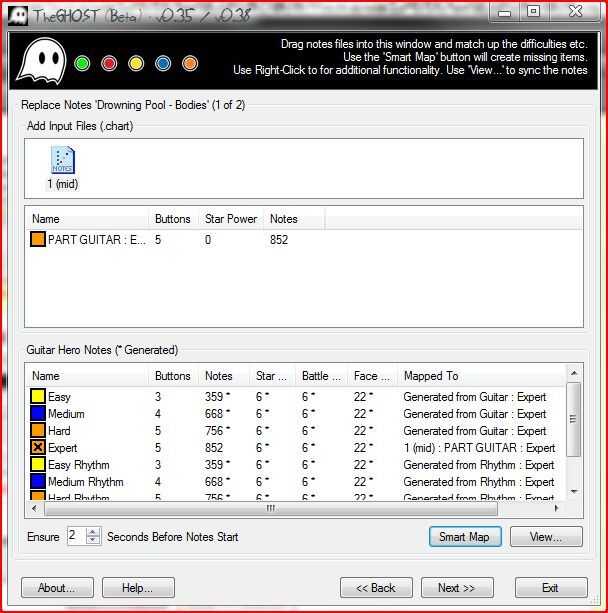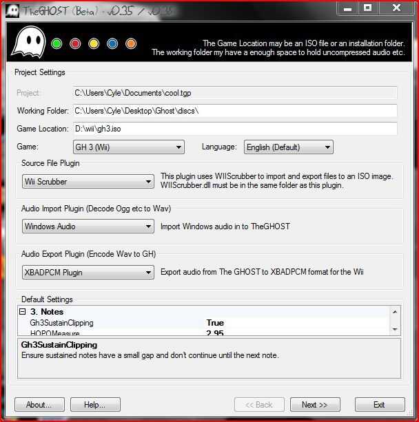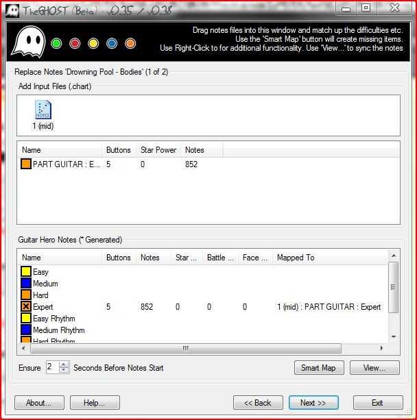 abrir el ghost.exe y haga clic en nuevo proyecto. el nombre y guárdelo. la carpeta de trabajo es donde se almacenan todos los archivos temporales durante la conversión. todo se borra al final del programa al salir, pero las canciones más que hacer a la vez, más espacio necesita. el juego debe tener lugar la ruta de la carpeta, luego un \ seguido de su nombre de la iso del juego. las cajitas se deben llenar lo siguiente: 1. lavador de wii 2. Windows audio 3. Xbadpcm plugin. Presione siguiente. Si no rellena correctamente en el juego ubicación o carpeta de trabajo, el espíritu caerá y tendrá que reiniciar. la siguiente pantalla le mostrará los niveles y canciones en ellos, además de las canciones de bono. Compruebe la que desea reemplazar, a continuación, haga clic en siguiente. si haga clic en exportar, básicamente se obtiene un archivo txt con todos los nombres de nivel y nombres de la canción dentro. Le dará una advertencia: No reemplace las canciones de batalla de jefe a menos que les preocupe su auto y es montones y montones de áreas de poder. hablo por experiencia, y ahora tengo ninguna manera de conseguir pasado slash porque la canción que escogí, brillo de labios y negro, solo tiene 2 áreas de poder. ya tengo mis carpetas de la canción, pero que necesita para conseguir el tuyo con el link que dí en la lista de fuentes. Arrastre la carpeta de la canción en la parte superior el botón smart. Asegúrese de que todos los datos es correcta, luego presione siguiente. Ahora, si descargó un paquete de la canción con dificultad desconocido o básicamente nada más que todo, necesitará haga clic aquí para permitir que el espíritu a las otras dificultades. si haga clic en ver, usted puede ver cómo las notas de héroe de la guitarra. las notas con los puntos blancos dentro son hammer ons y pull offs. cualquier sección azul que ves es poder. repetir con todas las canciones, luego seguir hacia abajo. Esta es una de las canciones que había revisado para corregir.