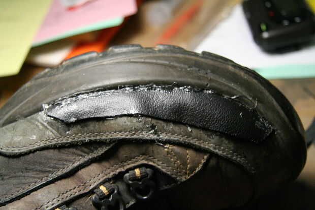 Pegar en alguna piel en el corte. Usted debe ser capaz de deslizarse el parche entre el cuero del zapato y la goma de la suela. Utilice pegamento del zapato que es flexible. Cuero de ante de uso que no está terminado en ambos lados. La rugosidad de la ayuda del palillo del pegamento. Abrir la ventana para no desmayar de los ridículos solventes en el pegamento que seque tan rápido.
