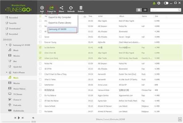 Después de la selección, haga clic en exportar , desde la barra de menús. Lista desplegable, seleccione el nombre del dispositivo para la transferencia. Entonces todos la música selecta se trasladará al dispositivo Android en poco tiempo, que depende de cuantas canciones le sólo los seleccionados.