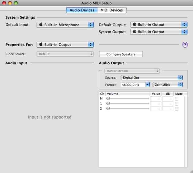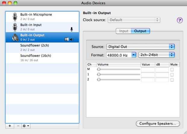 3: bajo salida de audio, ajuste el formato de 48kHz (48000Hz) y 2 canales 24 bits (no seleccionar audio digital codificado). La mayoría de archivos de vídeo será 48kHz, pero algunos son 44,1 kHz, si este es el caso, tendrá que cambiar el formato en Audio MIDI Setup, a 44,1 kHz (44100 Hz).