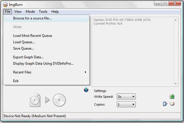 Cerrar la ventana de configuración, haga clic en escribir archivo de imagen al escritorio, haga clic en archivo y busque el archivo de código fuente, buscar el archivo ISO de Gamecube, en él una vez haga clic en abierto.