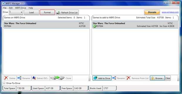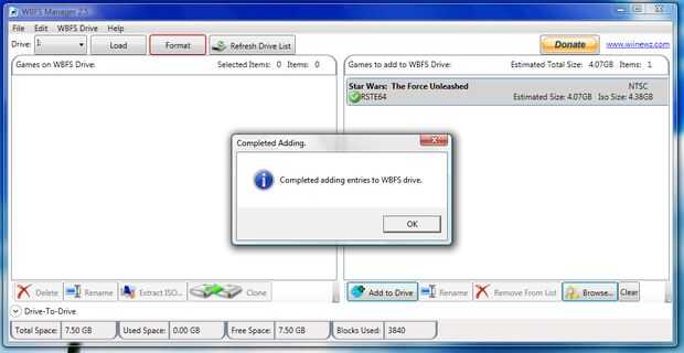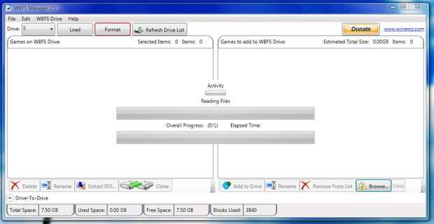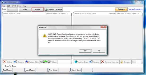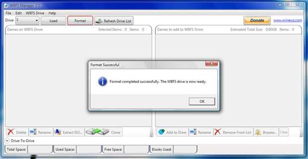 Ahora haga clic en formatear para borrar el contenido de su dispositivo USB y cambiar el formato a WBFS.