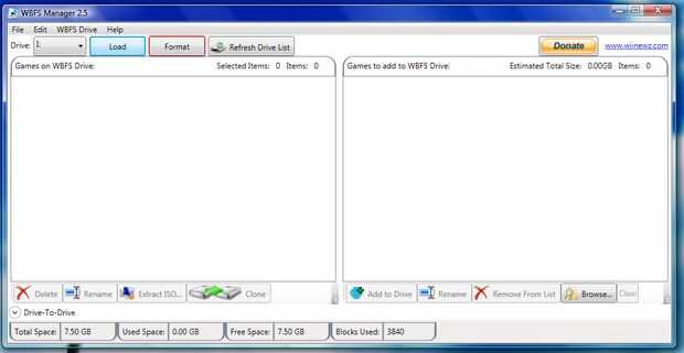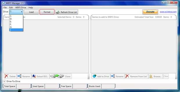 Conecte su dispositivo usb en su computadora. Haga clic en el icono de WBFS Manager 2.5 en tu escritorio. Se abrirá un nuevo n pantalla. Utilice la ficha desplegable debajo de "Edit" en la parte superior izquierda de la esquina para elegir la letra de unidad del dispositivo usb.