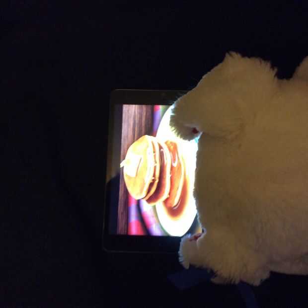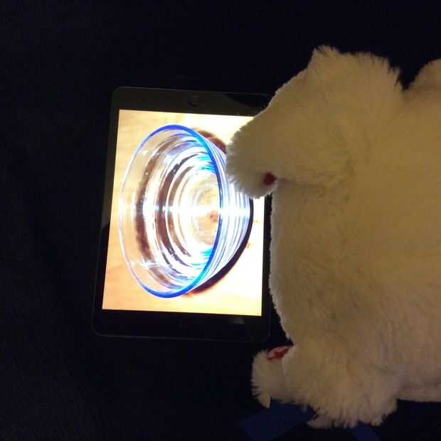 Haz un juego de tazón, (o real) y llenar con el alimento falso. Otra opción es abrir safari en un dispositivo IOS y encontrar una imagen que te gusta de un tazón de comida o agua y guardar en imágenes. Entonces, usted necesita abrir imágenes y fingir que su perro está comiendo el pic.