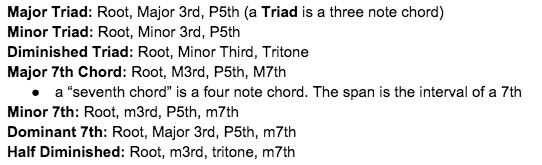 Acordes son notas que se tocan al mismo tiempo. Escalas se reproducirán en secuencia. A continuación se presentan fórmulas para tres tipos de acordes y la escala mayor: