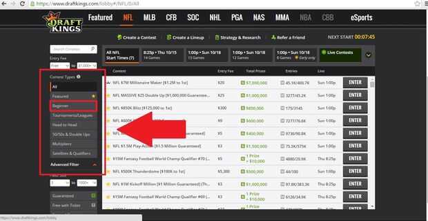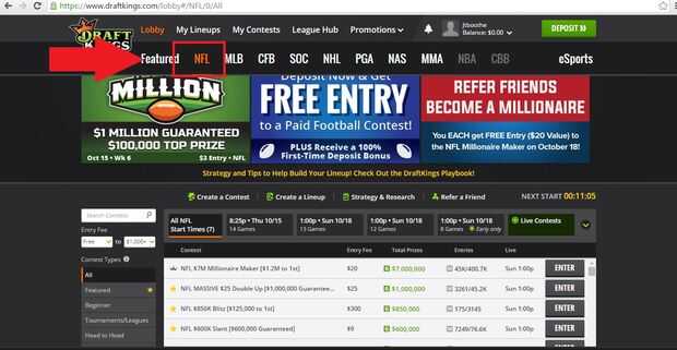 2.1. ahora que has inscrito, es tiempo para encontrar un concurso a. Seleccione Lobby desde la barra de navegación superior para ver toda la lista del concurso, luego NFL para seleccionar los partidos de la NFL disponible.