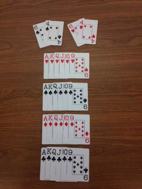 3. Retire los 4 y 6 de espadas y el 4 y 6 de corazones de las tarjetas que no utiliza para el juego. Estas tarjetas se utilizará para anotar. Cada equipo debe elegir un miembro del equipo para estar a cargo de la puntuación. Ver puntuación para obtener información sobre cómo marcar.