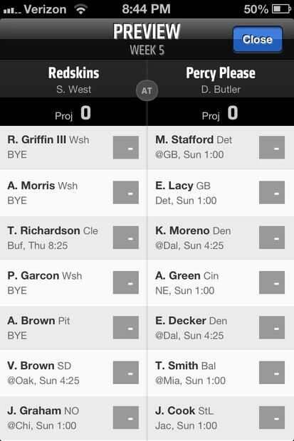 Todos los equipos de la NFL tiene una semana de descanso. Lo que significa que hay una semana fuera de la temporada que no juegan en absoluto. Si tienes un jugador o jugadores en una semana de descanso. Esto es cuando ves a tus jugadores de banco a para usted. Asegúrese de que su starter(s) no en su formación si tienen una semana de descanso que no tendrás puntos para ese jugador esta semana. En su lugar iniciar un jugador que tiene un duelo mal esa semana.