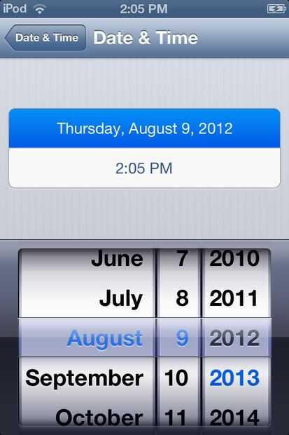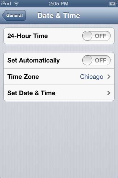 *** Este paso es CRUCIAL para este trabajo. USTED le cambio que volver más tarde así no traste *** Go en su iDevice, ir a ajustes > General > fecha y hora.  Ajuste automático de tiempo y hacia el año 2012. (Cualquier fecha antes de julio funcionará 15,2013, 2012 es simplemente más fácil)