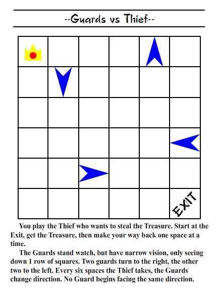 Hice este juego hace más de un año cuando estaba en la Universidad, y un montón de otros estudiantes encontró que era bastante la mente. Llevar a 5 personas, algo como el tesoro y un espacio lo suficientemente grande como para hacer una cuadrícula 6 x 6. El ladrón tiene un espacio en un momento el tesoro en el otro extremo y regresar al comienzo. Los guardias pueden sólo captura al ladrón si es en línea directa de visión, dictado por las plazas. De partida, cada guardia enfrenta a una dirección diferente, dos sólo gire a la izquierda, dos a la derecha y hacen sus giros cada vez que el ladrón toma un espacio. Lo que hace difícil que este juego es cuando los guardias cambian de dirección después de cada espacio 6. El ladrón no puede volver a un espacio que estaba justo antes, a menos que haga una regla especial o algo donde él puede solamente retroceder un espacio un determinado número de veces para deshacer su última vuelta o hacer la Guardia vuelva a girar.