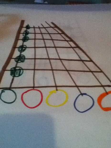 Utilizando el programa MakeyMakey, hemos construido una guitarra de un tablón de madera de desecho, diez tornillos, cinco hilos de cobre pelados y por supuesto el kit de creación MakeyMakey. La guitarra funciona como un controlador alternativo a la t