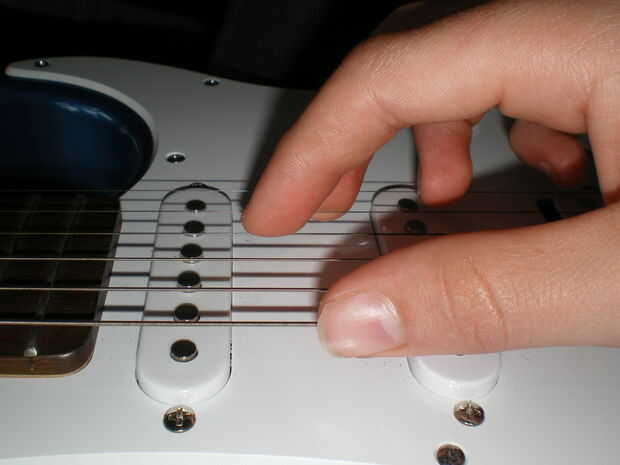 Tercera muestra la imagen donde normalmente tengo mi mano derecha. Me enseñaron a usar mi pulgar para arrancar las primeras 3 cuerdas y mis dos dedos de los otros 3 pero si se utiliza un plectro es irrelevante.