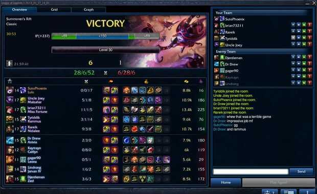 La pantalla de resultados ahora aparecerá, mostrando numerosas estadísticas y datos sobre cómo realiza cada campeón/jugador en el juego. También verás Cuánta experiencia e IP han ganado. IP se puede utilizar para comprar a nuevos campeones. Una vez comprado, estos campeones son permanentemente desbloqueados y pueden ser jugados en cualquier momento! Experiencia le dará acceso a beneficios adicionales como nuevos hechizos de invocador y maestría.
