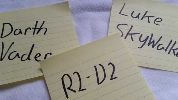 Escoge un nombre para cada persona jugar y escribir en una nota post-it no dejó ninguno de los jugadores ver los nombres hasta que el juego comience. Los nombres pueden ser gente que conozcas, celebridades, dibujos animados, personajes de un libro, figuras históricas, ect... Usted consigue la idea. Si la fiesta tiene un tema, use nombres del tema. (guerras estrellas ejemplo: Luke Skywalker, Obi-wan Kenobi, Darth Vader, los Sith. Hay muchas posibilidades, pero tenga en cuenta la conveniencia edad y grupo de los nombres. No hacen tan difícil que la gente da para arriba.