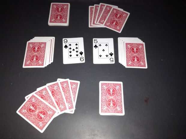 Para comenzar el juego, cada jugador llega a una de las cartas sobre la mesa de centro y enciende su rostro. Los jugadores ya pueden comenzar a colocar las tarjetas. Tarjetas a uno de los pilotes deben ser uno más o uno menos que el valor nominal de la tarjeta superior en la pila. El orden de las cartas es el estándar as-10, Jack, Reina, rey, donde los valores de bucle de nuevo más alto a más bajo (es decir, ases colocan en Reyes, Reyes a ases). Después de que una tarjeta se ha colocado en una pila, el jugador recoge uno de los restantes 15 tarjetas de visita (en el inicio del juego) así que siempre tiene 5 cartas en su mano (a menudo engañar y tomar la pila entera a la vez). Si ninguno de los jugadores puede poner otra tarjeta en una pila de centro, ambos jugadores escoge una tarjeta de los pilotes colocados a ambos lados de los montones del centro y lo coloca en la pila del centro más cercana. Si ambos jugadores aún no se mueven, repita este proceso hasta que hayan desaparecido todas las tarjetas, en cuyo caso, las tarjetas de la parte inferior de las pilas del centro se colocan en la parte superior.
