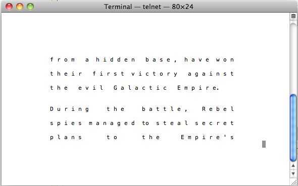 Este instructable le mostrará algo de diversión y cosas útiles que hacer con la aplicación Terminal de Mac.Terminal puede ser accesado por ir a aplicaciones > Utilidades > TerminalPaso 1: Star WarsAbrir Terminal, copia y pega esto en (telnet towel.b