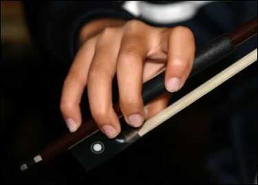 3. Sostenga el arco por colocando el pulgar en la punta entre la madera y los pelos del arco y que se encrespa sus dedos alrededor de la madera del arco como se muestra en la imagen.