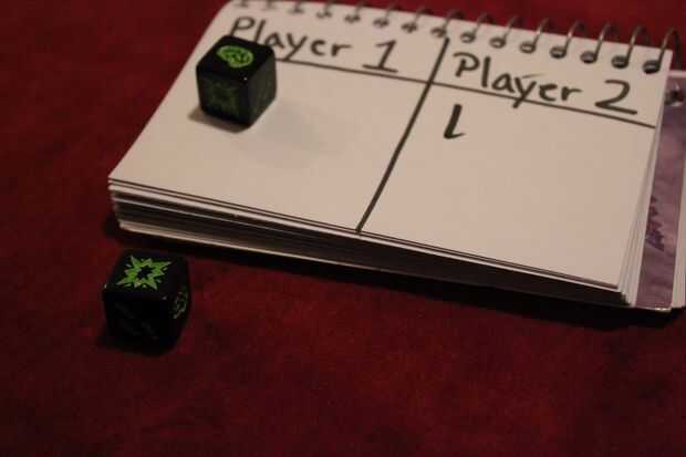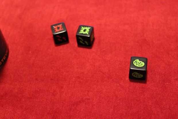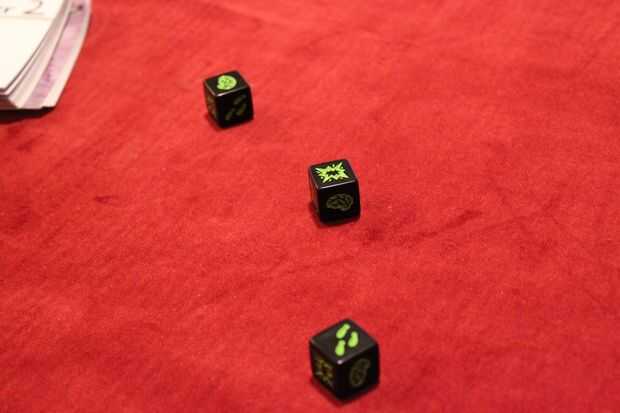 Dicen que rodar un cerebro, un tiroy muere de uno paso. Debe colocar el tiro y el cerebro a un lado y agarra 2 dados más del envase y añadir a la matriz de paso. Ahora estás a 3 dados; rodillo y volver. Si este tiempo de repente tira 2 tiros más, han perdido su uno cerebro que has acumulado esta ronda. Luego es el turno del jugador 2.