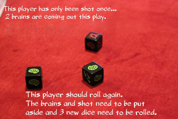 Dados Zombie es un juego de dadosde juegos de Steve Jackson. Es una cerveza ocasional rápida y juego de pretzels. Radndomly usted escoja tres dados de una taza y hacerlas rodar. El objetivo es presionar tu suerte y obtener tantos cerebros como sea po