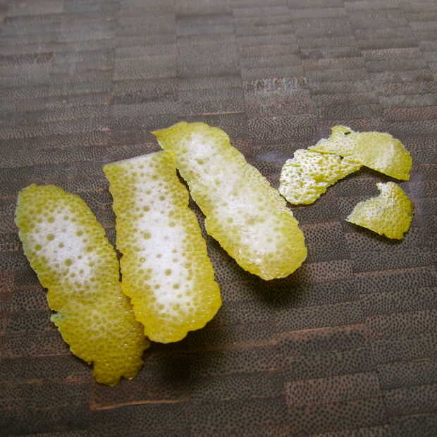Tiras grandes parecen lo mejor, pero usted siempre puede cortar la piel en trozos más pequeños si le ayuda a obtener menos médula. Dependiendo de lo que estás usando el entusiasmo, puede dejar la cáscara en tiras grandes, julianas o chop finamente.