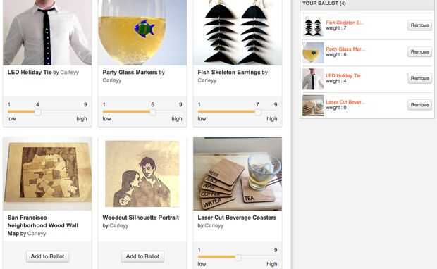 2. tasa de finalistas 1-9: utilizamos La votación de la gama. Para valorar cada proyecto arrastre el cursor a continuación del proyecto en la boleta electoral para votar el proyecto 1-9. Debe mover cursor - hasta moverlo va a dar el proyecto una puntuación de 0. Si desea un 5 para el proyecto, arrastre el cursor lejos y volver a 5 por lo que el voto cuente. Puede encontrar los requisitos de evaluación en el paso 4.