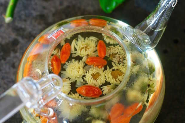 No te teaware de vidrio. La ventaja del vidrio es que se puede apreciar la aparición de hojas sueltas y las hierbas en el bote cuando está siendo elaboradas. Véase por ejemplo la imagen de arriba cómo se utiliza una tetera de vidrio para la fabricación de flores y las bayas de goji. Sin embargo, cristal no aisla calor como porcelana y yixing, así que Aléjese de él cuando oolong.