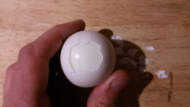 Huevos duros medio toman 8 minutos. Empresa tomar hasta 30 minutos. El secreto revelado aquí es bajar la cáscara sin rompiendo el huevo.Paso 1: Hervir un huevo Poner suficiente agua en la bandeja para cubrir el huevo. Llevar a hervir. Hervir durante