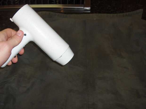 Una vez tengas tu chaqueta encerada completamente, es el momento de derretir la cera en el algodón. Encienda el cabello secador de alta temperatura y manténgalo unos poquitos de la chaqueta. Podrás ver las manchas de cera gruesa derretir en a la chaqueta. Tomé el pincel en una mano y el secador de pelo en el otro. Trabajando juntos, volver a derretir la cera en la chaqueta y había cepillado de la tela. Esto funcionó especialmente bien para las costuras.