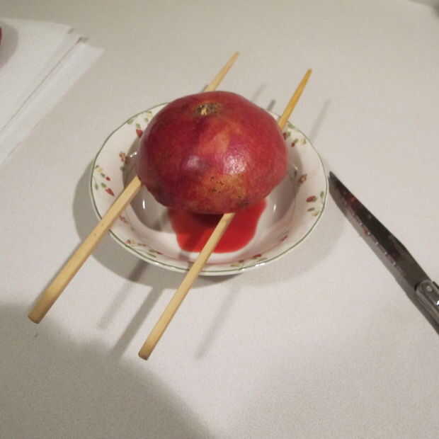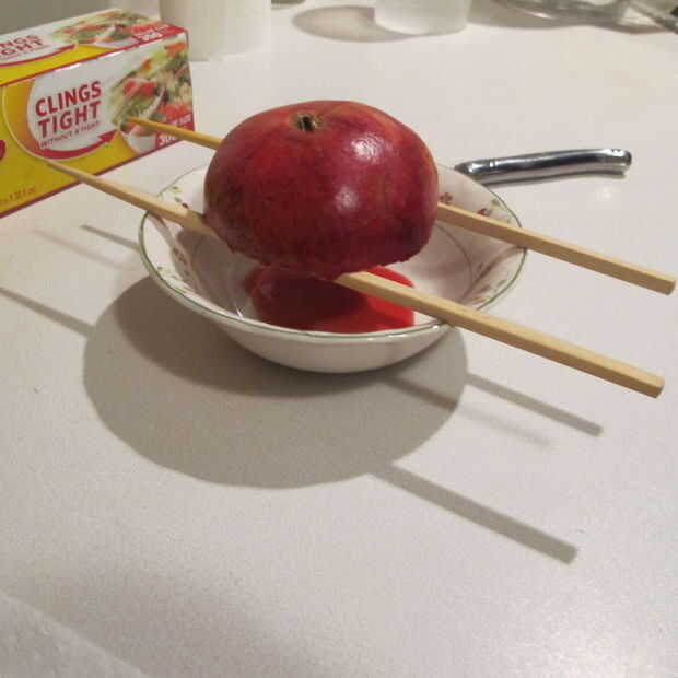 Tomar los dos palillos y colocar sobre la parte superior del tazón de fuente, unas pulgadas de distancia. Luego tome una mitad de su Granada y colocarlo, lado de la semilla hacia abajo, encima de los palillos. Debe ser suspendido sobre el tazón de fuente bastante firmemente (es decir, no tambaleante o simplemente equilibrada. Es necesario que sostenga un poco de una paliza.).