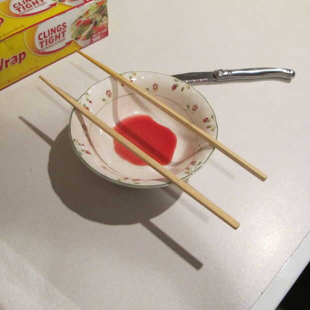 Si no tienes ningún palillos en mano, usted puede probablemente salirse con utilizando un par de cucharas o algo así, como eres cuidado de no romper el recipiente en pasos posteriores. Pinchos de bambú podrían trabajar, pero puede utilizar más de dos por lo que no rompen.