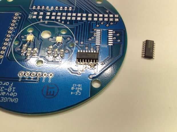 1) Coloque una pequeña cantidad de soldadura sobre una almohadilla, calor para arriba y coloque el IC en el plato.