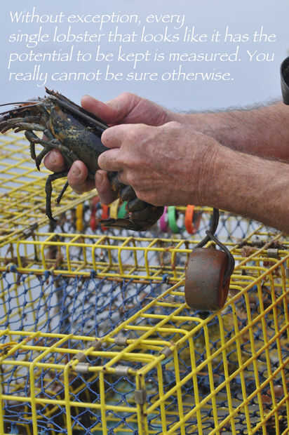 Medida adecuada significa midiendo desde la parte inferior de la cavidad del ojo en la parte inferior del caparazón: la medición debe ser al menos 3 1/4" pero no mayor que 5". Hay fuertes multas para la toma de una langosta que es demasiado pequeño o demasiado grande. Y usted puede conseguir en el mismo problema si capturan con piezas de langosta - como las colas. Si atrapa con una cola de langosta y luego no hay manera para comprobar el tamaño que la langosta entera. Encontramos a la cola de la langosta en una trampa, era pequeño y Bob dice que es de otras langostas comer eso langosta.