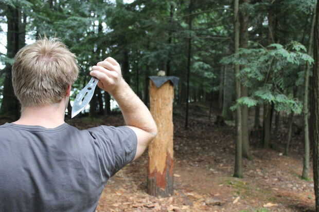 Ahora agarre el cuchillo de su mango (hoja mirando al cielo). Lanzar tu cuchillo con una fuerza moderada en su destino. Se centran en su postura y permanecer relajado, ya que este tiro tendrá bastante un poco más precisión que la rotación media del tiro.