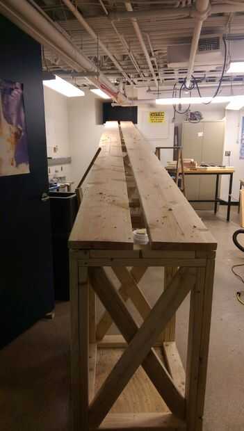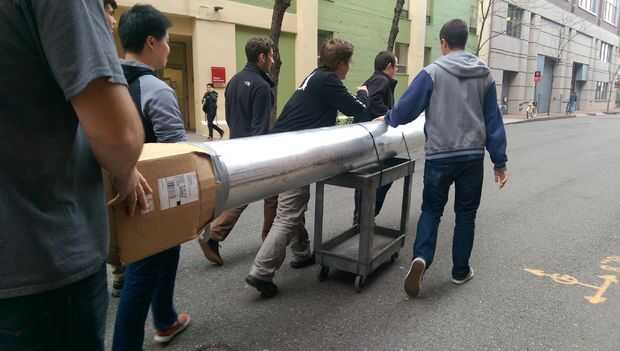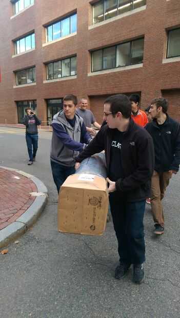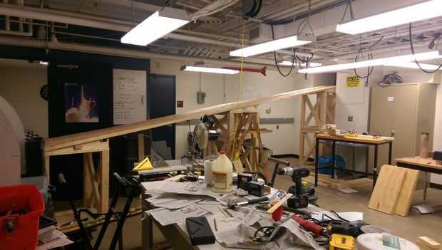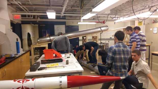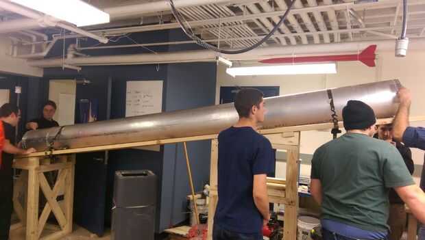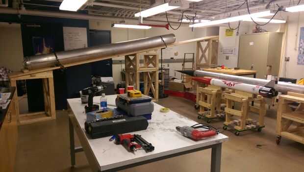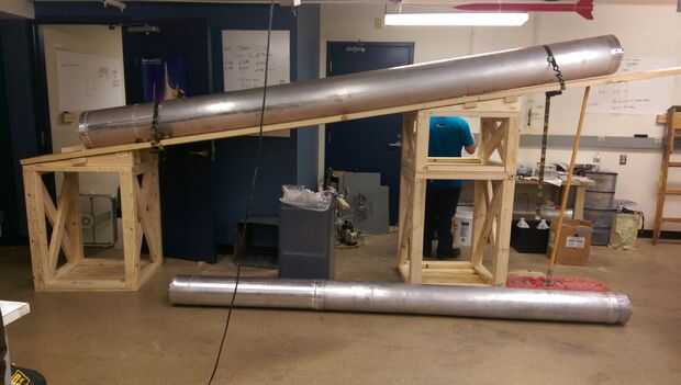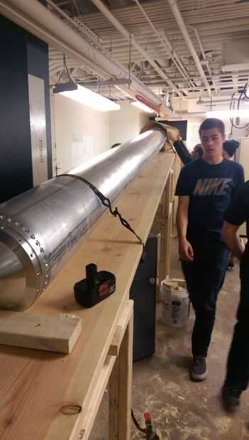 El cohete Mk V se acerca a lo largo de! tenemos el tanque en que casa realmente condujo cuánto este cohete va a ser. Tenga en cuenta, este tanque que ves en las fotos es menos de la mitad el cohete entero. Para obtener el cohete en el sótano, Dónde está nuestro laboratorio, tenemos que ir a través de la ventana. Una vez que esté montado el cohete, su va a deslizarse por la ventana en el Banco de prueba, que se derrumbó ángulo coincide con el de la rampa. El motor completamente montado (que se utiliza para pruebas estáticas) es 24 pies de alto, con el cohete entero siendo 32 pies de altura.