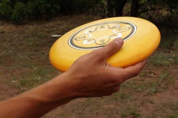 2. agarra el frisbee con tu mano derecha y coloque su pulgar en la parte superior del disco volador y los otros cuatro dedos en la parte inferior. < la primera imagen con un disco volador amarillo. > el "bowl" del frisbee debe hacia abajo cuando el brazo está paralelo al suelo y el dedo pulgar hacia el cielo.