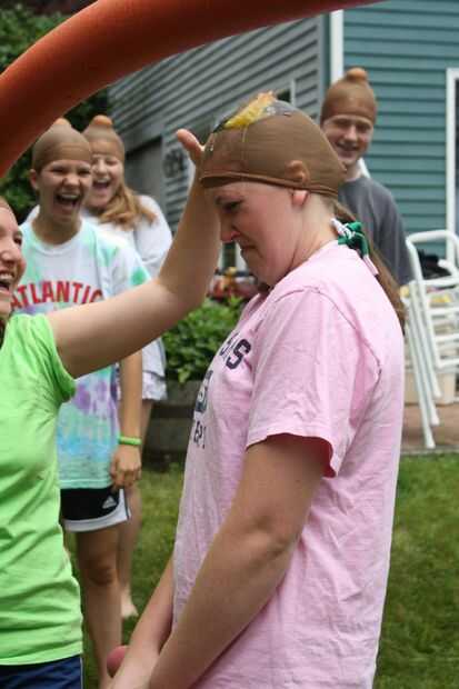 • Los jugadores deben poner el huevo en la punta de las medias y tire las medias encima de su cabeza hasta que tiene el huevo apretado en la parte superior de su cabeza.