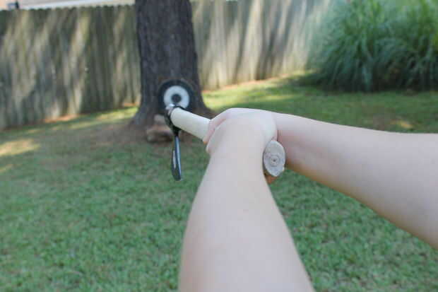 Mira en la parte superior del mango. Luego alinearlo mejor que puedas con el centro de su objetivo.