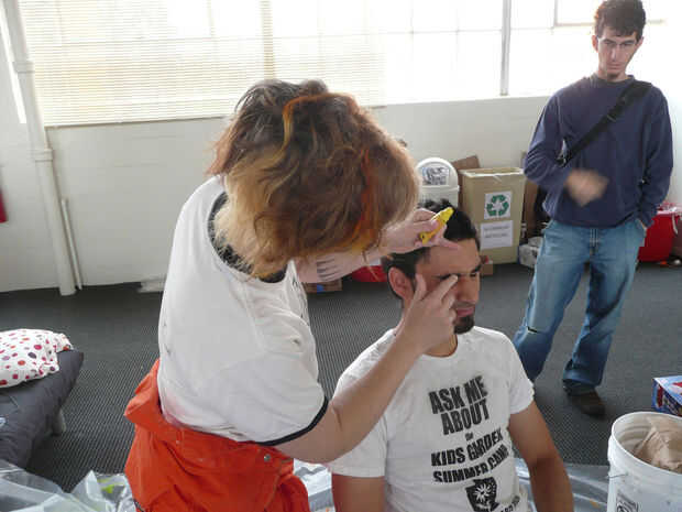 Tienen su castee Siéntese cómodamente en una silla que es de metal o plástico, o cubierto con un dropcloth. Deberán mantener relativamente quieto por alrededor de media hora a 45 minutos. En mi búsqueda en internet siempre vi gente frotando vaselina en las cejas y alrededor de los bordes del cabello, pero me parece que esto no ayuda mucho en la prevención el alginato se adhiera al cabello y oscurece el yeso en puntos si no te todo apagado el alginato antes de verter. Yo llamo a esto opcional.