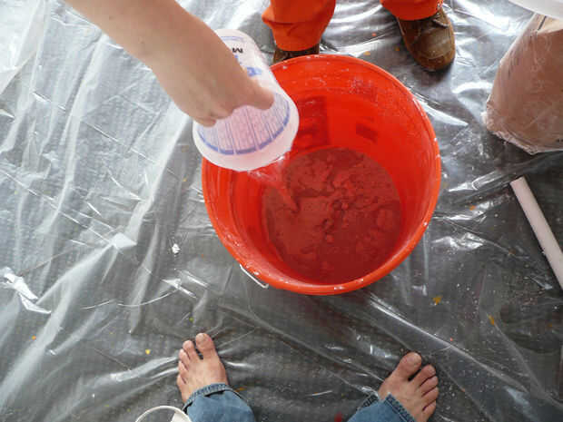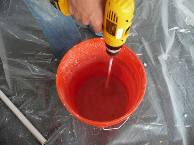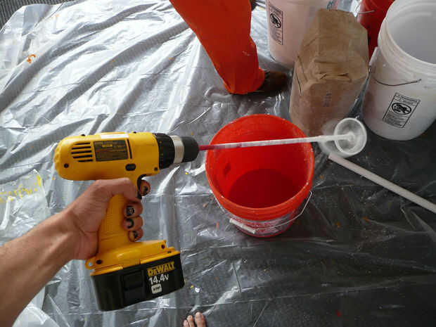 Otra vez es polvo y el agua, pero esta vez mezcle el agua con el polvo. Utilice un balde grande donde eres improbable de derrame. Si tienes un taladro eléctrico mezcla accesorio que funciona genial, si no se mezcla vigorosamente con un agitador de pintura u otros palo fuerte. Raspe los lados inferior y las esquinas con frecuencia.