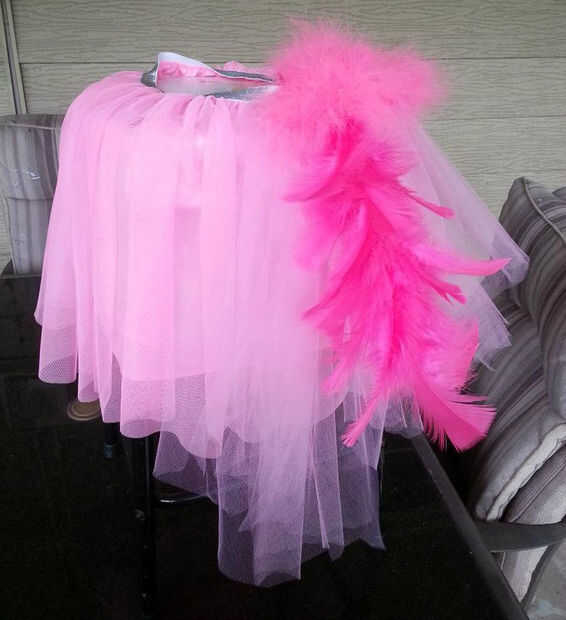 La falda de tul es una pequeña falda de chicas he comprado y ha añadido las tiras de tul, una boa esponjosa y un acento floral con plumas color rosa. Son todo atados con cinta rosa y Unidos a la falda con pernos de seguridad.