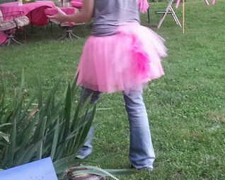 Hice un fascinator personalizado y una falda de tul rosa.