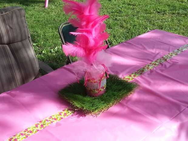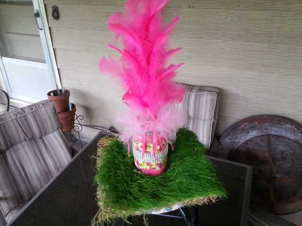 Los centros de mesa se hicieron con un tarro de masón, el cojín de pasto, ductape flamingo, cinta scotch, bling plástico, cinta de color rosa, tul y acento floral de plumas rosa. Usted también se necesita caliente pegamento.