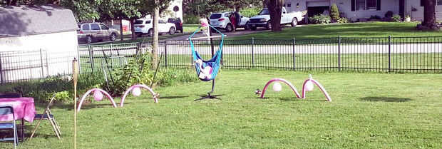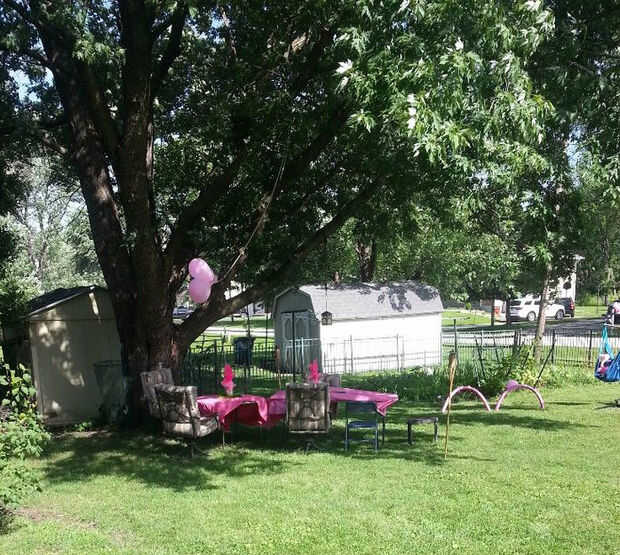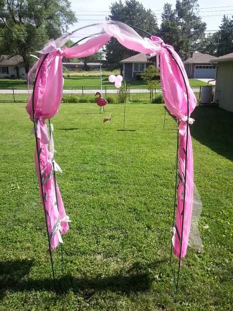 El arco utiliza la tela recogida de buena voluntad y algunos filamentos de tul. Globos de color rosa fueron atados a través hacia fuera de la yarda. El flamenco más grande es un recorte de cartulina con serpentina papel pegado al cuerpo y un pico y el ojo cortado de papel de construcción. Las piernas son las tiras de metal aerosol pintado rosa.