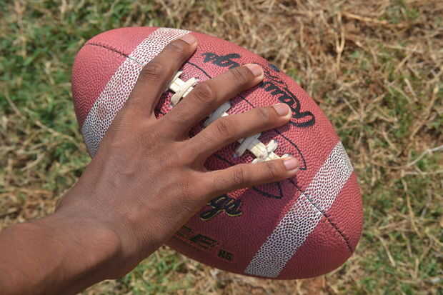 A). Coloque la mano sobre la bola con el dedo índice más cercano a la punta de la bola y por encima de los cordones.