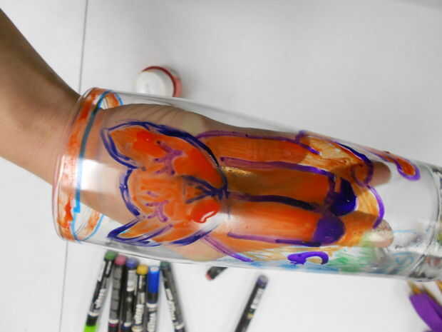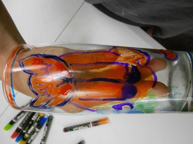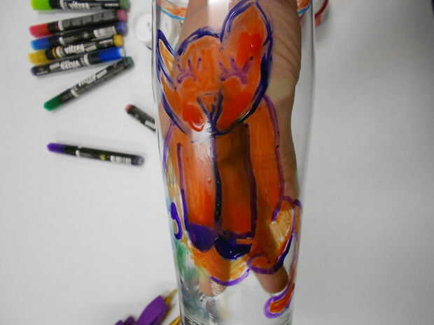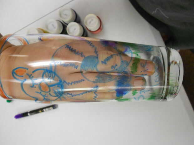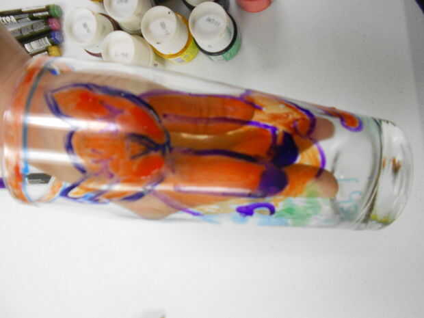 Exponer sus pinturas e ir a tomar agua si es necesario. Empezar a pintar. Aquí está un youtube video sobre cómo funcionan. Pinturas Pebeo fueron diseñados para imitar el efecto de vitral. Son una de mis pinturas favoritas de vidrio porque duran para siempre. Una de las ventajas de estos que nuestro grupo ha encontrado es que no hacen esa cosa de sustancias pegajosas repugnantes que barato hacen pinturas y son caja fuerte del lavaplatos.
