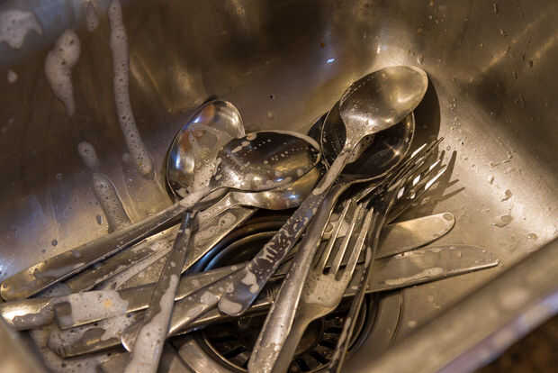 La técnica de "llenar el fregadero con agua" y luego lavar platos es casi inevitablemente difícil para el manejo de cubiertos. A menudo alguien se dejan algunos platos y posiblemente poner un cuchillo en el agua y sin saber que podría hundir su mano en el fregadero buscando lo siguiente lavar y podría lastimarse seriamente.- Cómo solucionarlo: La mejor práctica es para lavar cuchillos a la derecha después de usarlos - no sólo mantiene más (ya que no se sientan sucios o en el agua durante largos periodos) pero entonces siempre estás seguro de cuchillos.