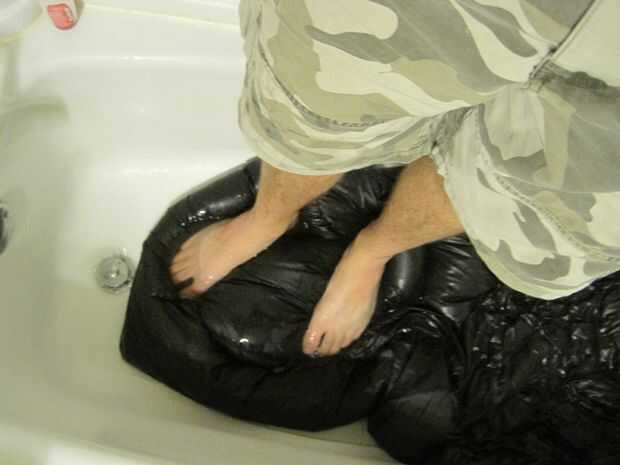 Para este paso, que el sucio agua de desagüe de la bañera. Tienes que exprimir el exceso de agua sucio de su bolsa de dormir caminando sobre ella o doblándola sobre sí mismo y de compresión. Tenga cuidado al mover el saco de dormir ya que son muy muy pesados y no queremos que rip. Hagas lo que hagas, nunca trate de sacar hacia fuera de un saco de dormir. Esto arruinar el aislamiento y hacer inútil su saco de dormir.