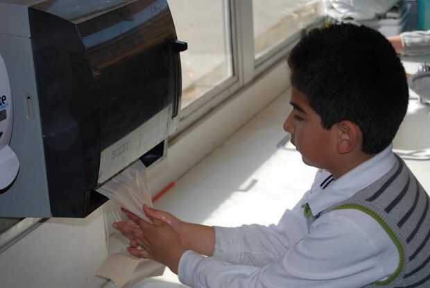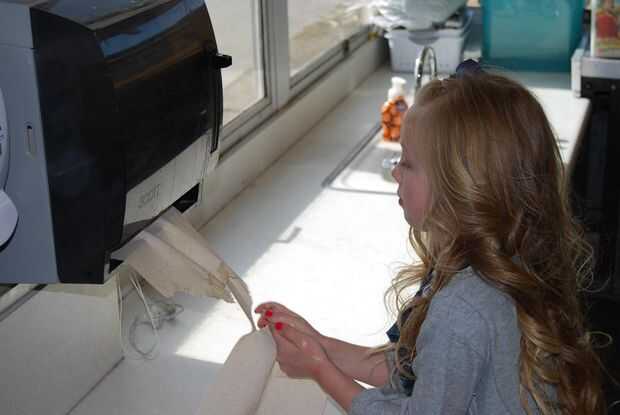 Después de enjuagar las manos (sin cerrar la mezcladora), coge la toalla de papel preparado desde el dispensador.  Séquese las manos y frotar ligeramente la toalla encima para bajar cualquier gérmenes restantes.